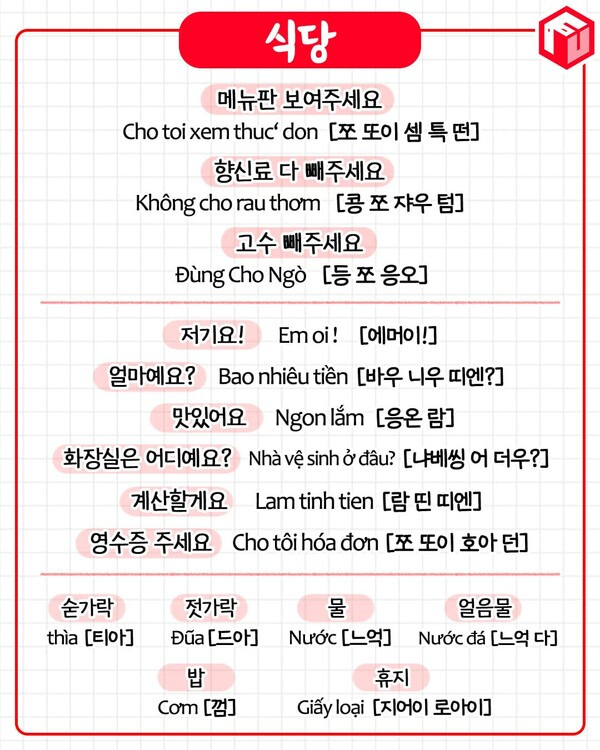 베트남 식당 회화로는 다양한 표현이 필요합니다. 우선 메뉴판 보여주세요는 베트남어로 ‘Cho toi xem thuc‘ don [쪼 또이 셈 특 떤]’입니다. 고수를 빼고 싶다면 ‘Đùng Cho Ngò [등 쪼 응오]라고 말할 수 있는데요. 고수 외 향신료를 모두 빼달라고 하고 싶을 떄에는 ‘Không cho rau thơm 콩 쪼 쟈우 텀]’이라고 말하면 됩니다.