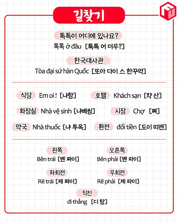 여행 중 찾게되는 주요 장소들과 방향 표현도 베트남어로 정리해뒀으니 꼭 저장해두시고 현지에서 유용하게 활용해보시길 바랍니다.