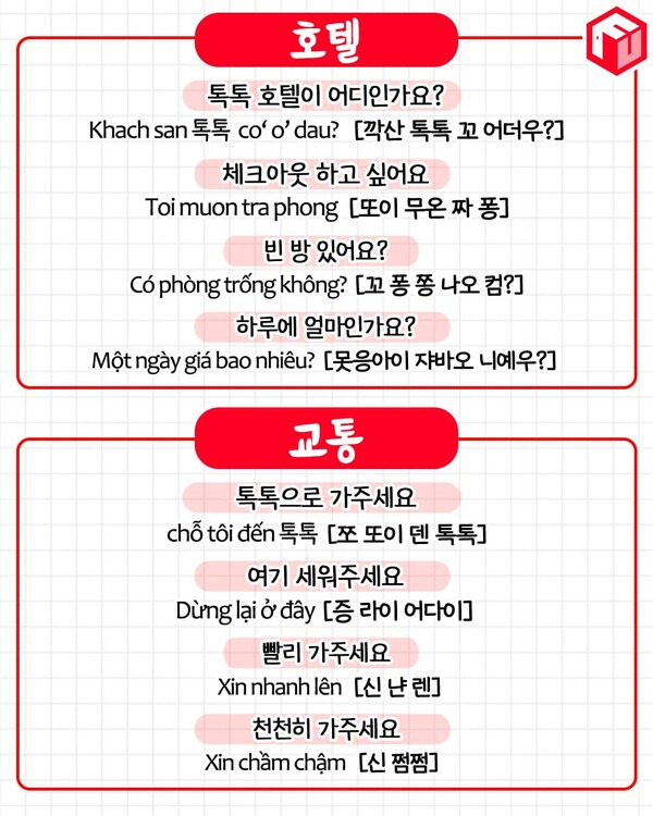오늘 여행톡톡은 상황별 베트남 여행 회화를 총정리해 공유합니다. 보기 좋게 상황별 베트남 여행 회화를 한 장에 모두 담았으니 필요한 부분은 이미지를 저장해 현지에서 꺼내 보세요!