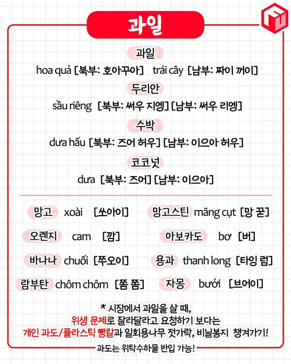 베트남에서는 당도 높고 신선한 과일을 저렴한 가격에 마음껏 즐길 수 있습니다. 시장이나 마트 등에서 원하는 과일을 찾을 때 유용한 과일 표현입니다. 베트남어로도 함께 표시해뒀으니 가게의 간판 등에서 보다 편리하게 원하는 과일을 찾을 수 있으시길 바랍니다.